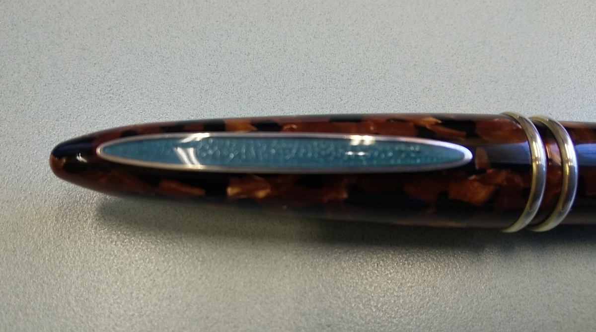 首軸と尾軸の金属(プラチナコーティング)との組み合わさって、抜群の筆記バランスとなります。ちなみに、キャップはしません。キャップ自体の重さはかなりのもので、尾軸にキャップをポストできるのでしょうが、明らかにリアヘビーになります。キャップをポストしない状態でも、尾軸の金属部分の重さがあり、親指と人差し指の間に適度な重みが加わり、抜群の安定感を与えてくれます。